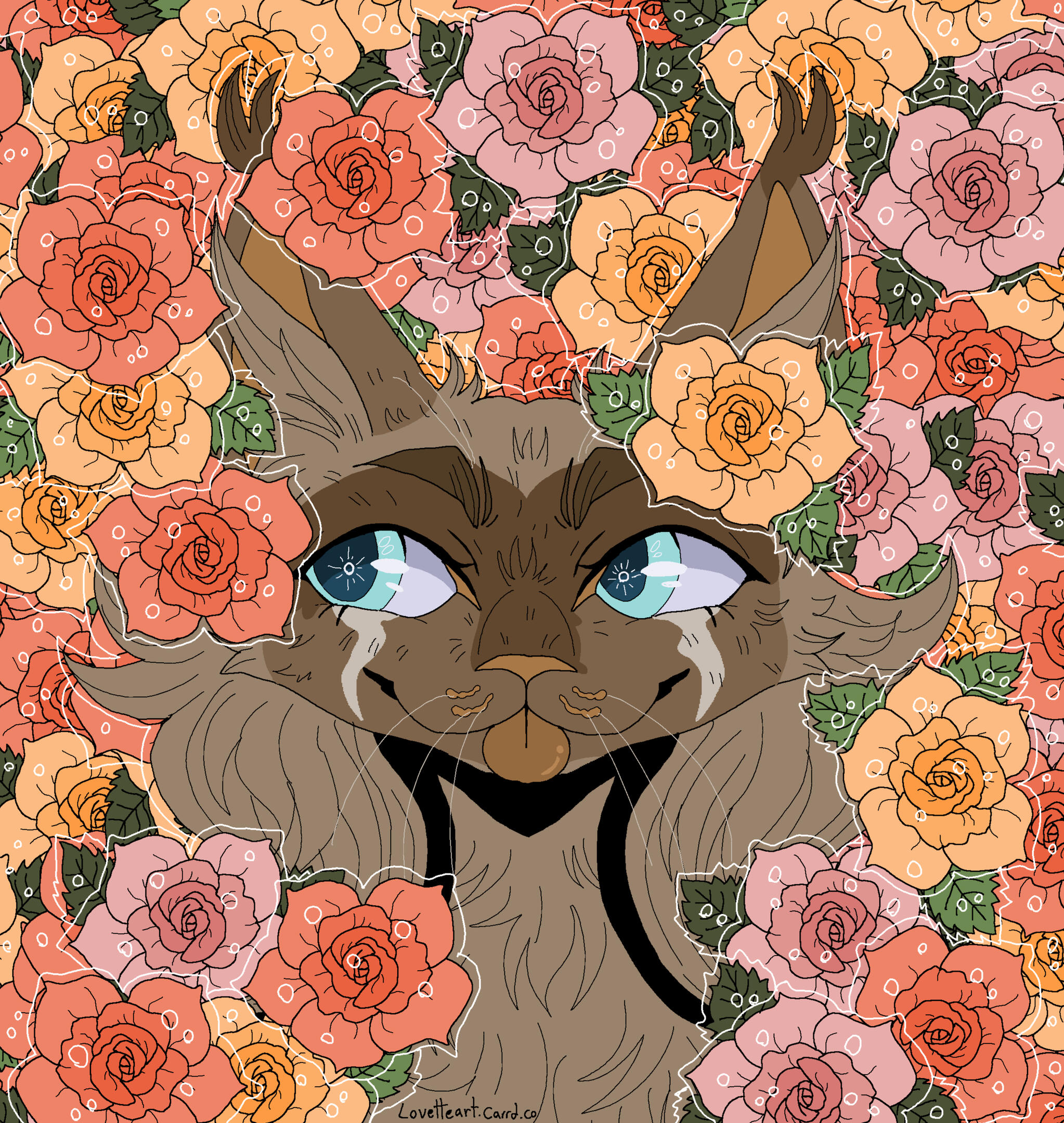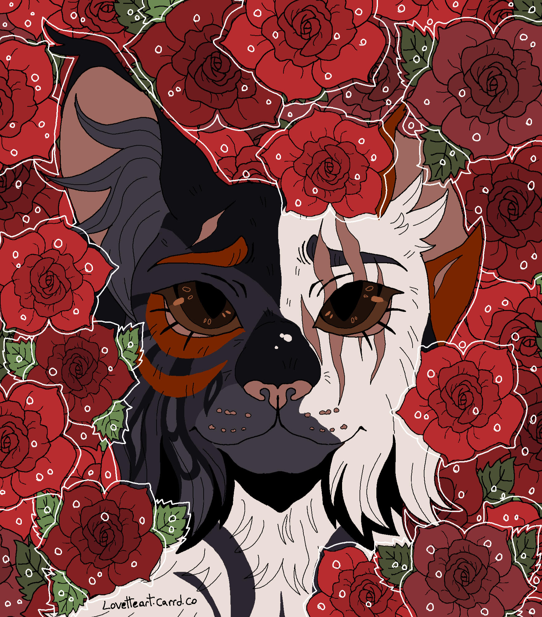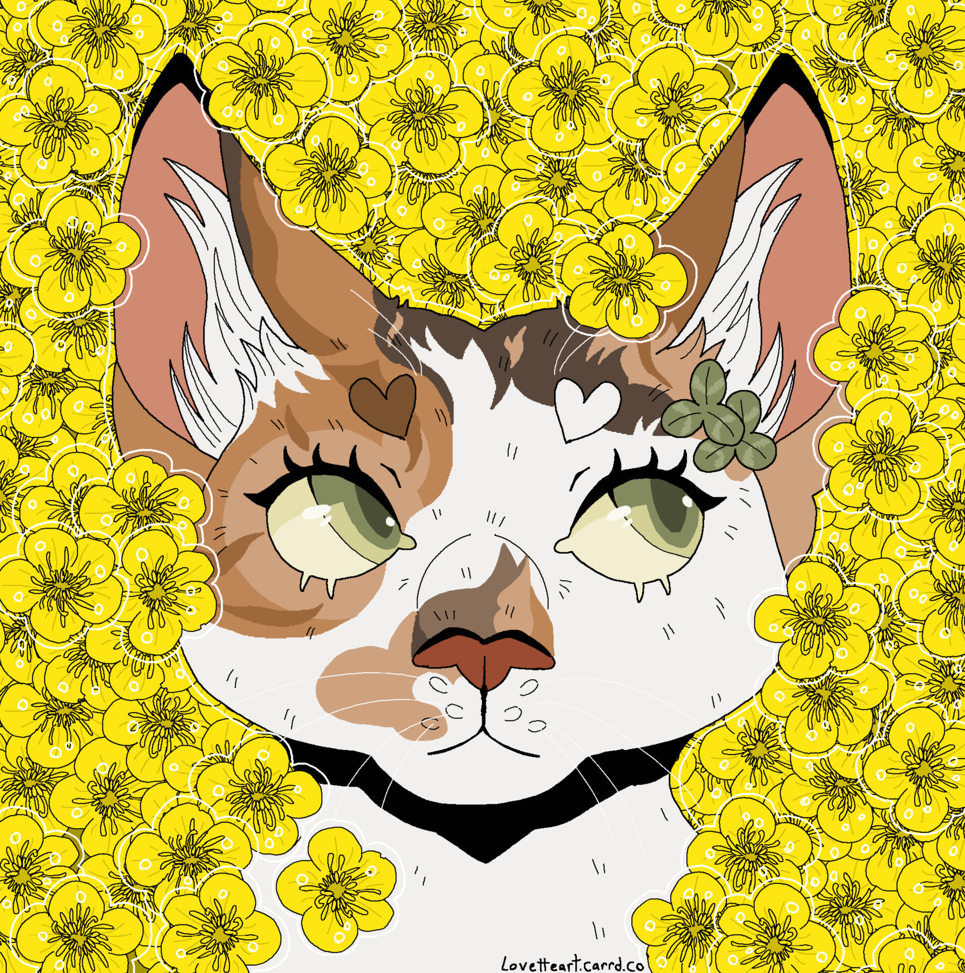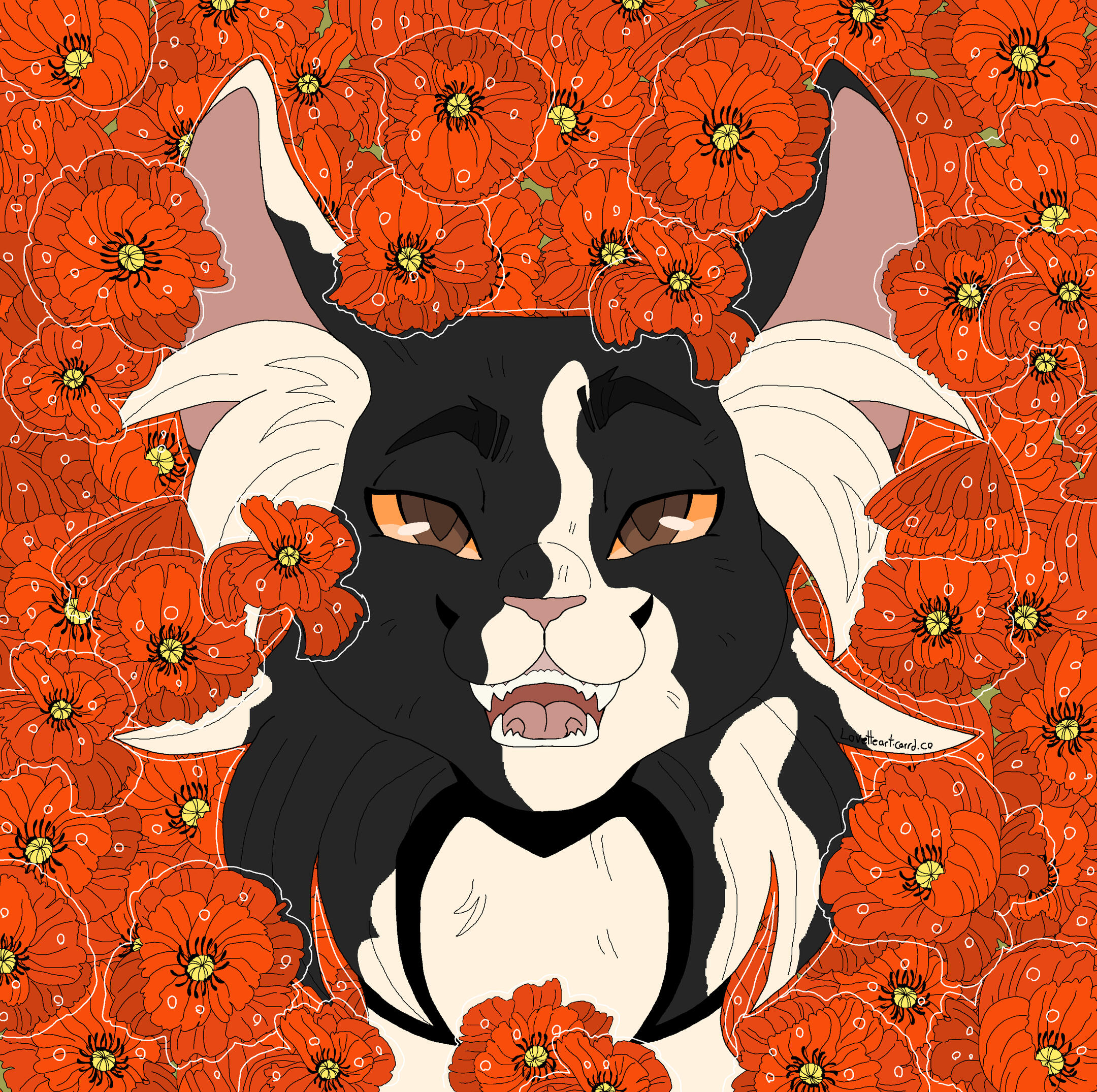 Description: A symmetrical headshot with a floral background. Backgrounds currently available: Shojo Roses, Shamrock Bed , Daisies (may or may not have the white outline depending on how light the daisies are), Leaves (Maple, Oak, Generic or Fall mix) , Poppies, Green Ivy, Violets ( tricoloured or solid), Yellow Buttercups25.00 USD Red Spider lilies (spider lilies will come with a black background and no white outline/ droplets), Blue Forget-me-nots (no white outline/ droplets and your choice of bg colour between pale neutral, green, black or yellow pop), White lilies (no white outline or droplets, set background colour of green)PSA: Lilies are extremely deadly to cats, ingesting them or even inhaling their pollen can cause kidney failure and death within as little as 3 days, please bring your cat to the vet immediately if you suspect any kind of consumption