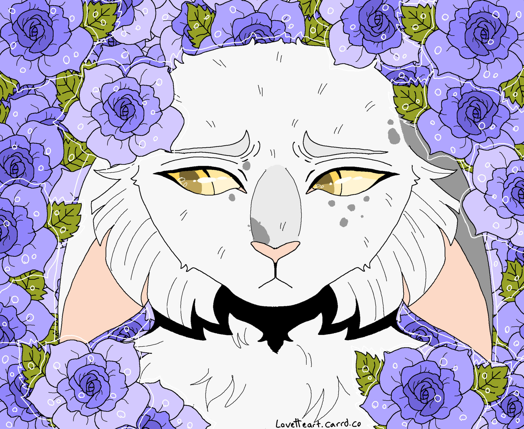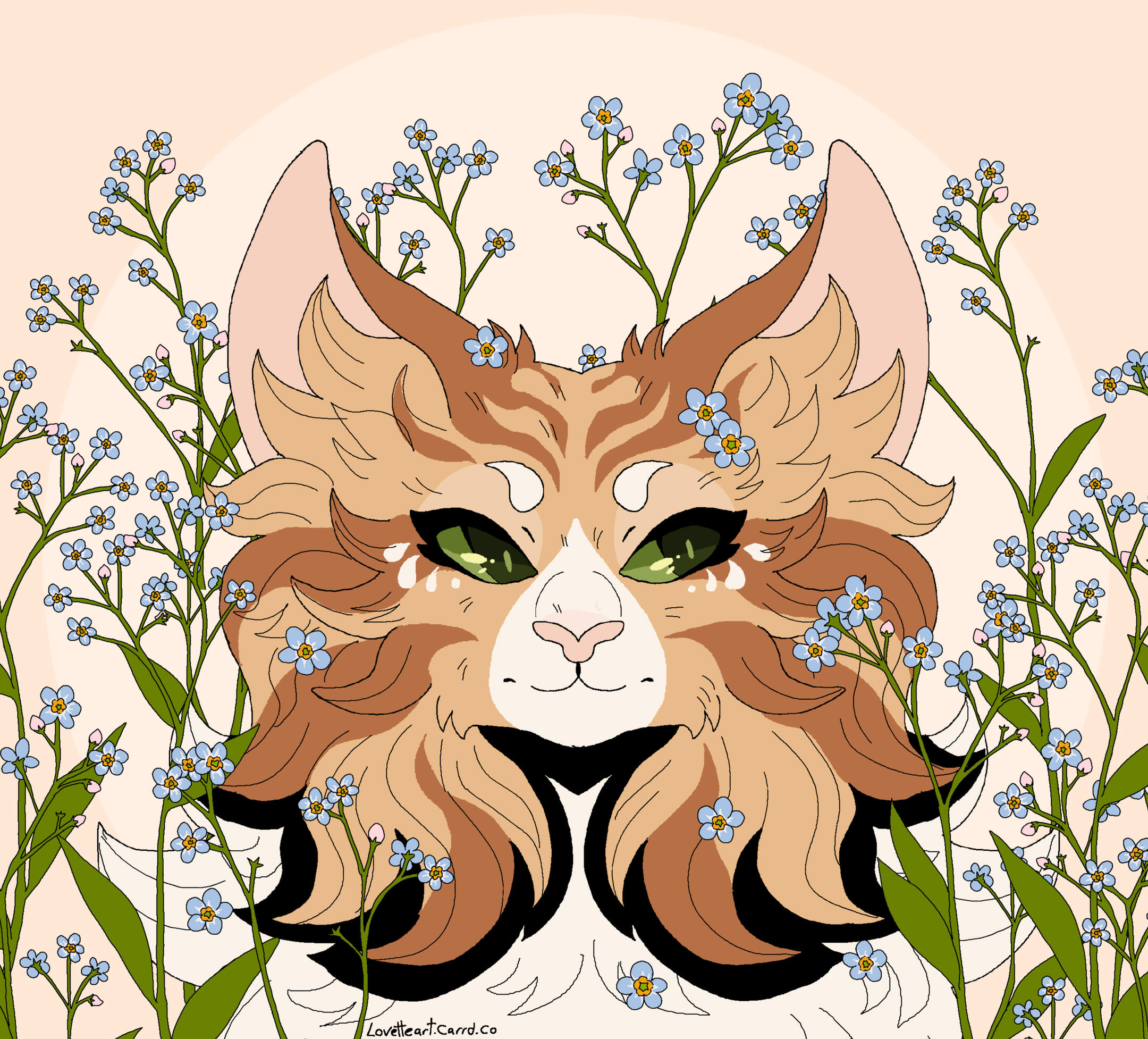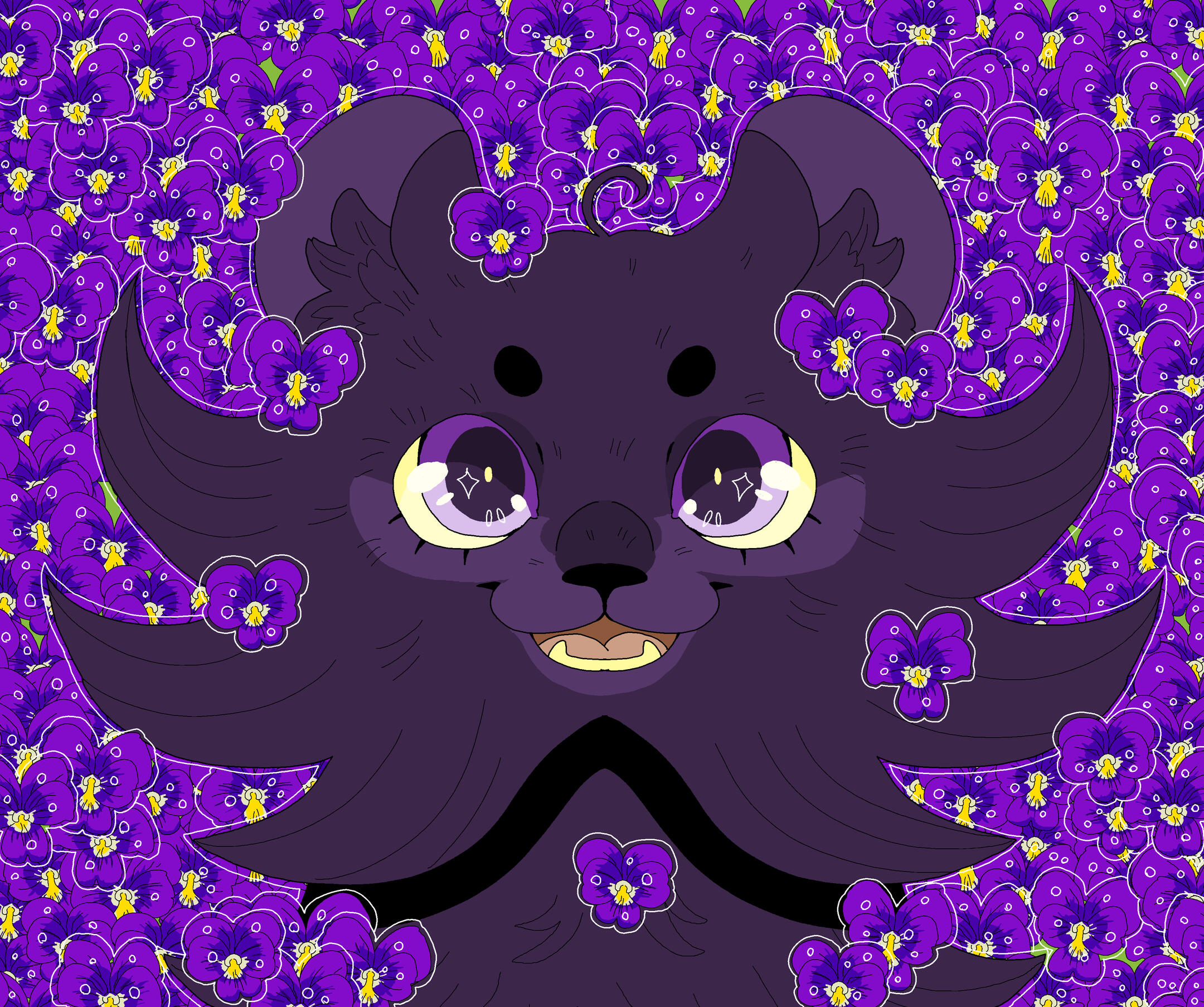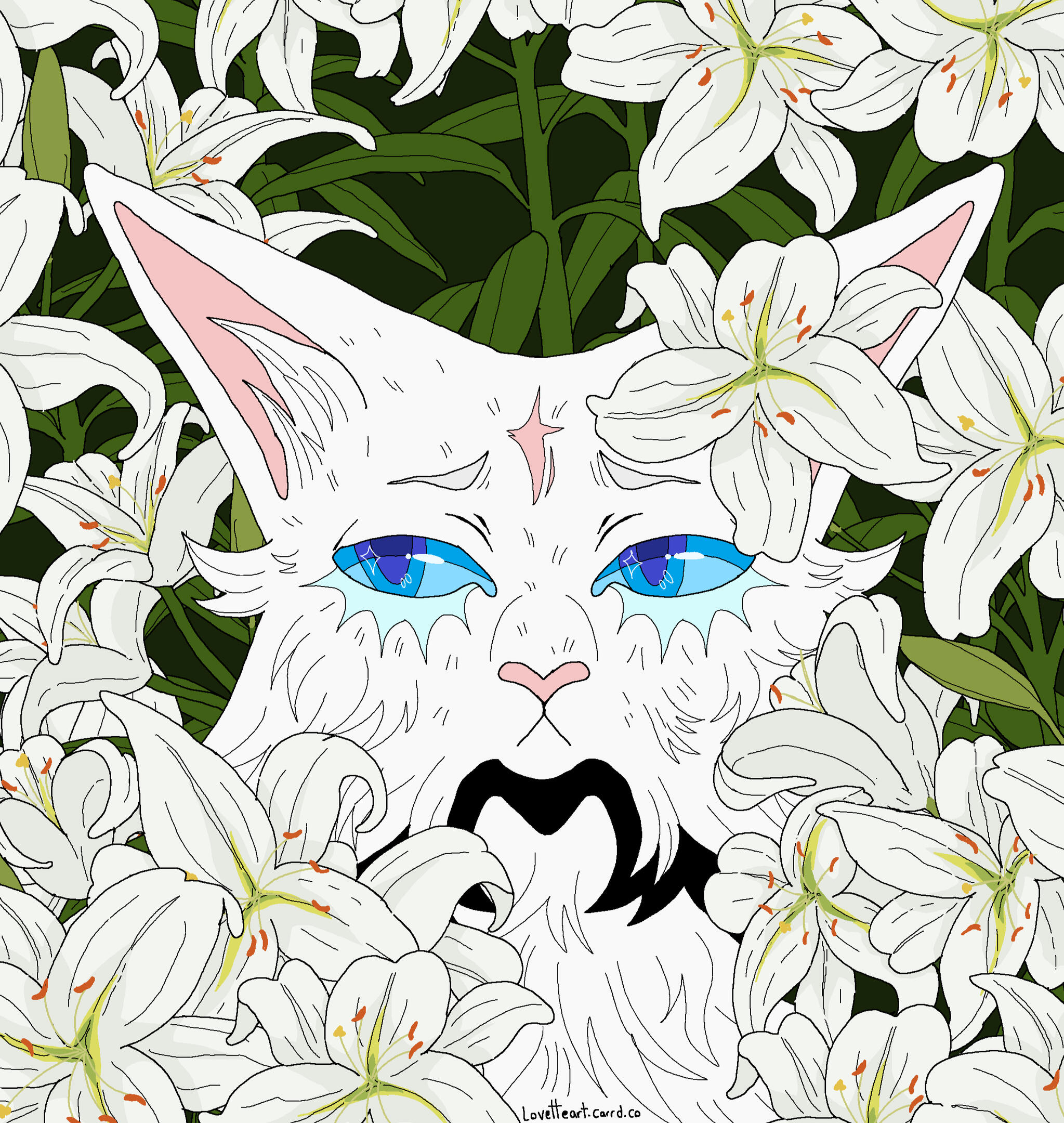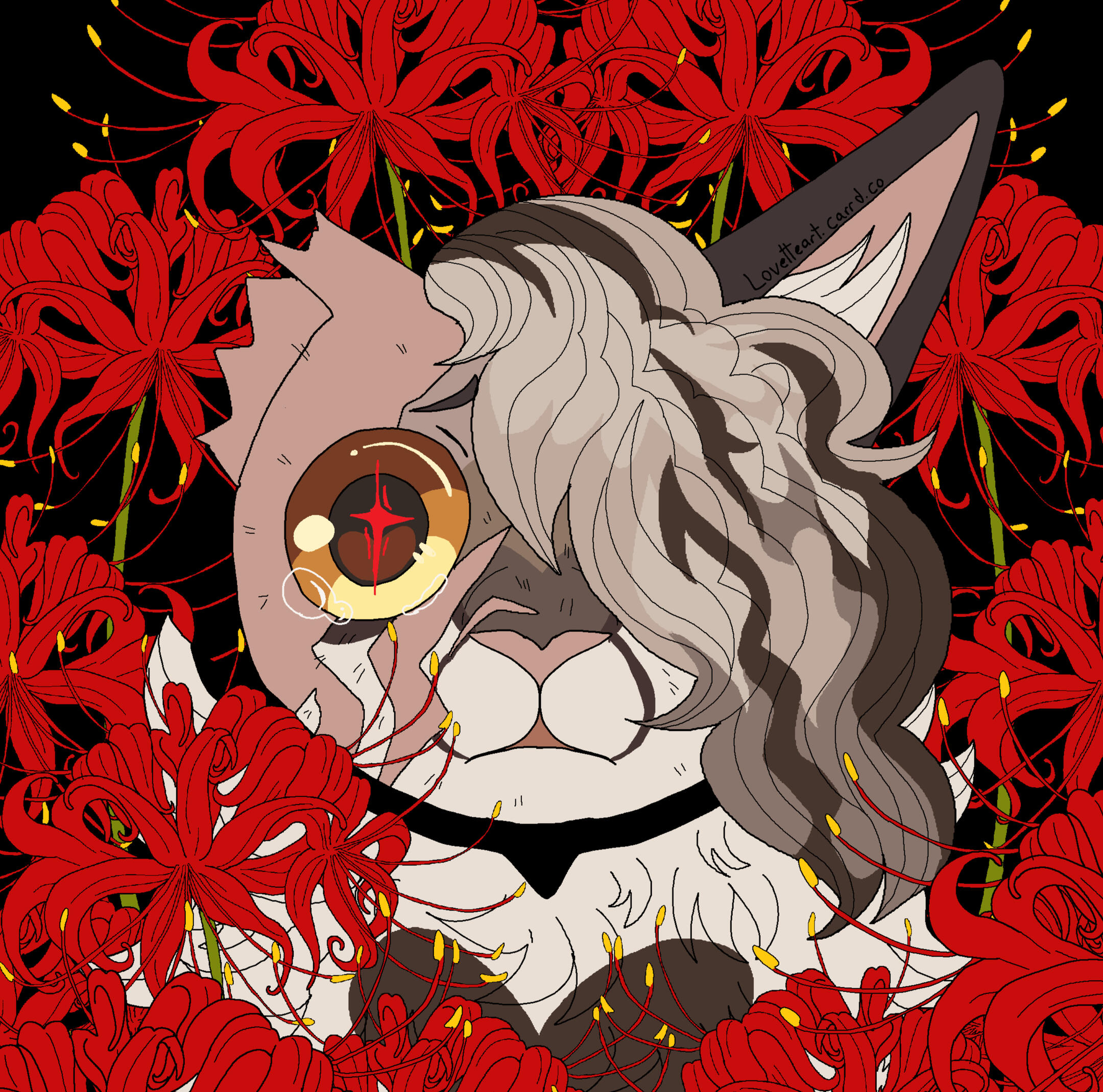 Description: A symmetrical headshot with a floral background. Backgrounds currently available: Shojo Roses, Shamrock Bed , Daisies (may or may not have the white outline depending on how light the daisies are), Leaves (Maple, Oak, Generic or Fall mix) , Poppies, Green Ivy, Violets ( tricoloured or solid), Yellow Buttercups25.00 USD Red Spider lilies (spider lilies will come with a black background and no white outline/ droplets), Blue Forget-me-nots (no white outline/ droplets and your choice of bg colour between pale neutral, green, black or yellow pop), White lilies (no white outline or droplets, set background colour of green)PSA: Lilies are extremely deadly to cats, ingesting them or even inhaling their pollen can cause kidney failure and death within as little as 3 days, please bring your cat to the vet immediately if you suspect any kind of consumption
