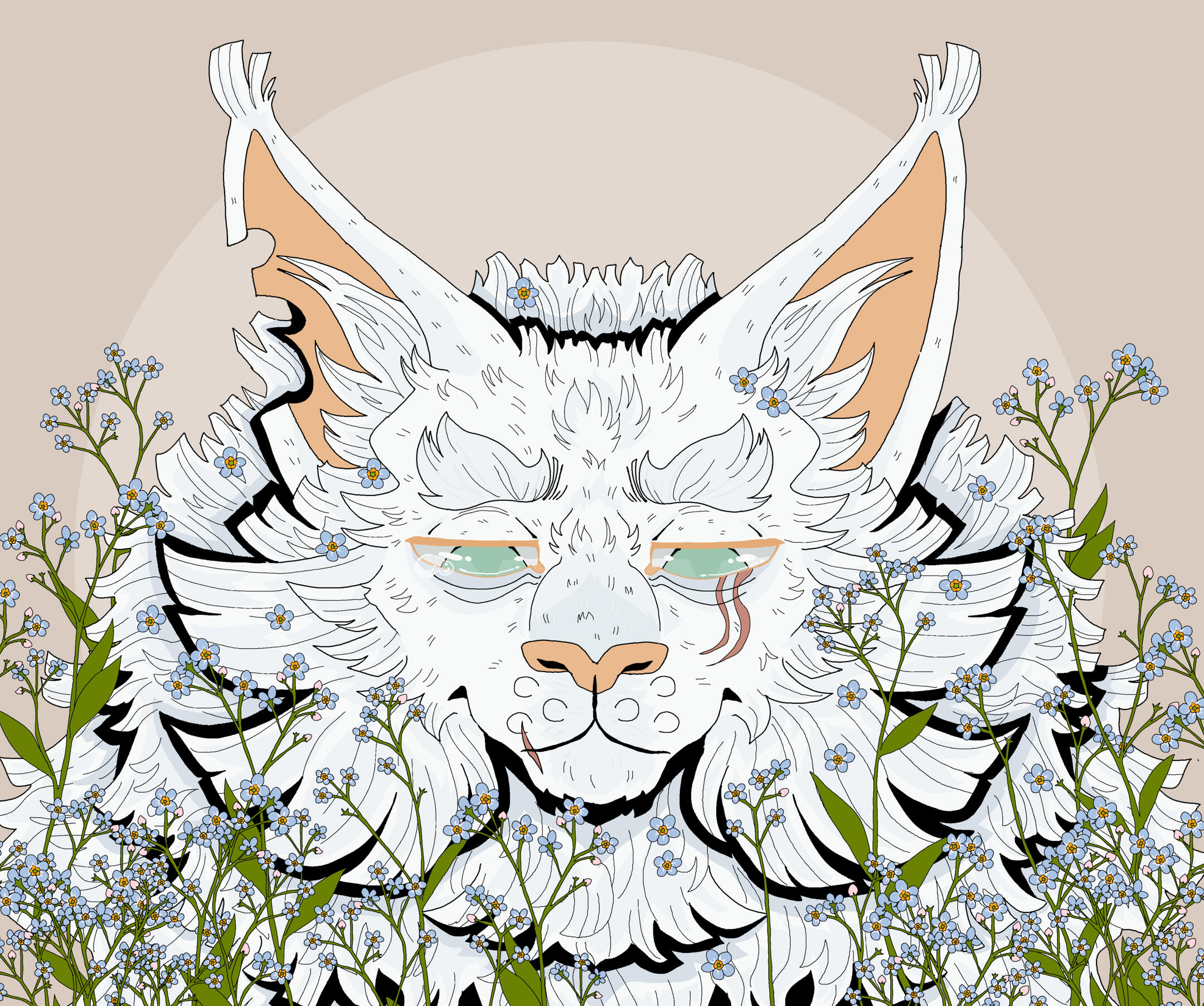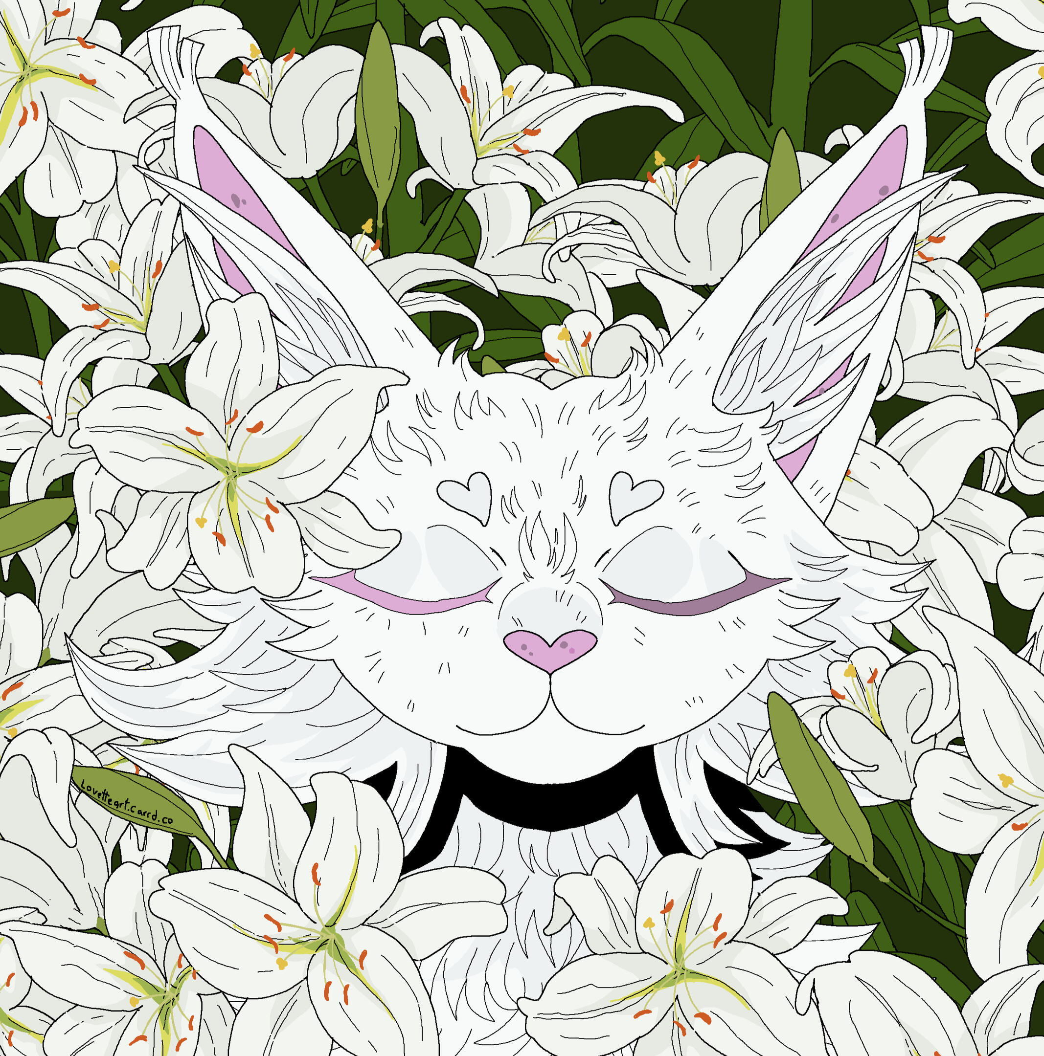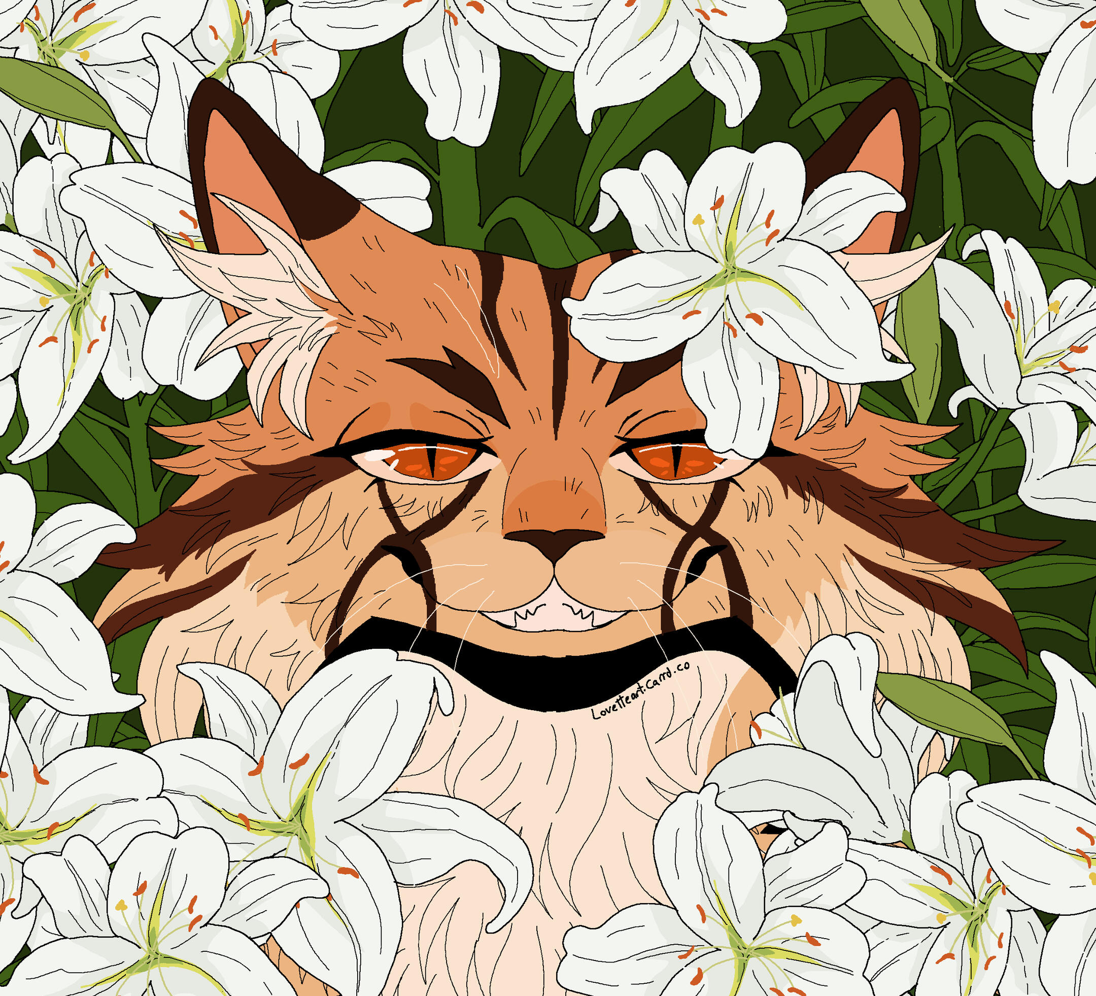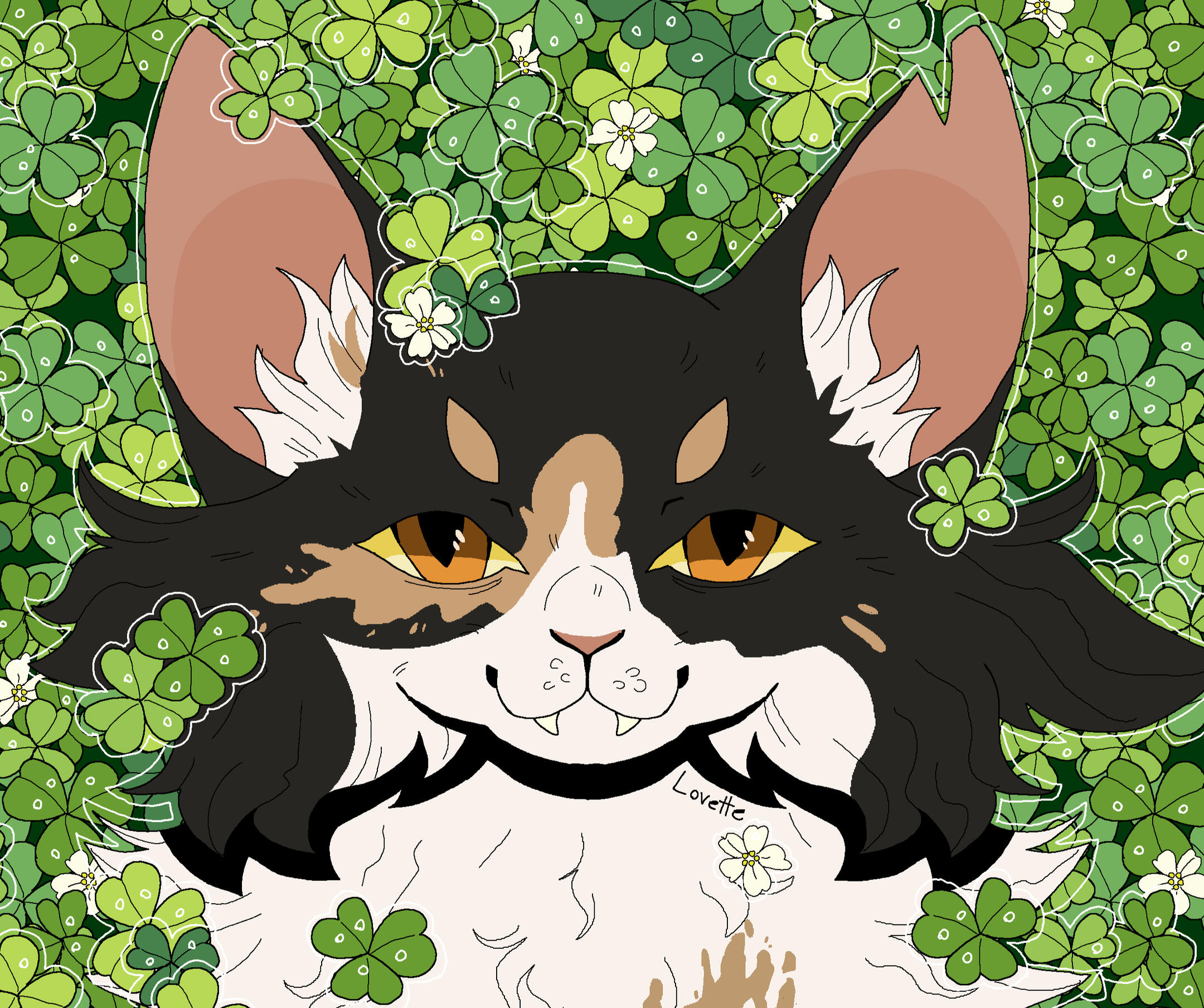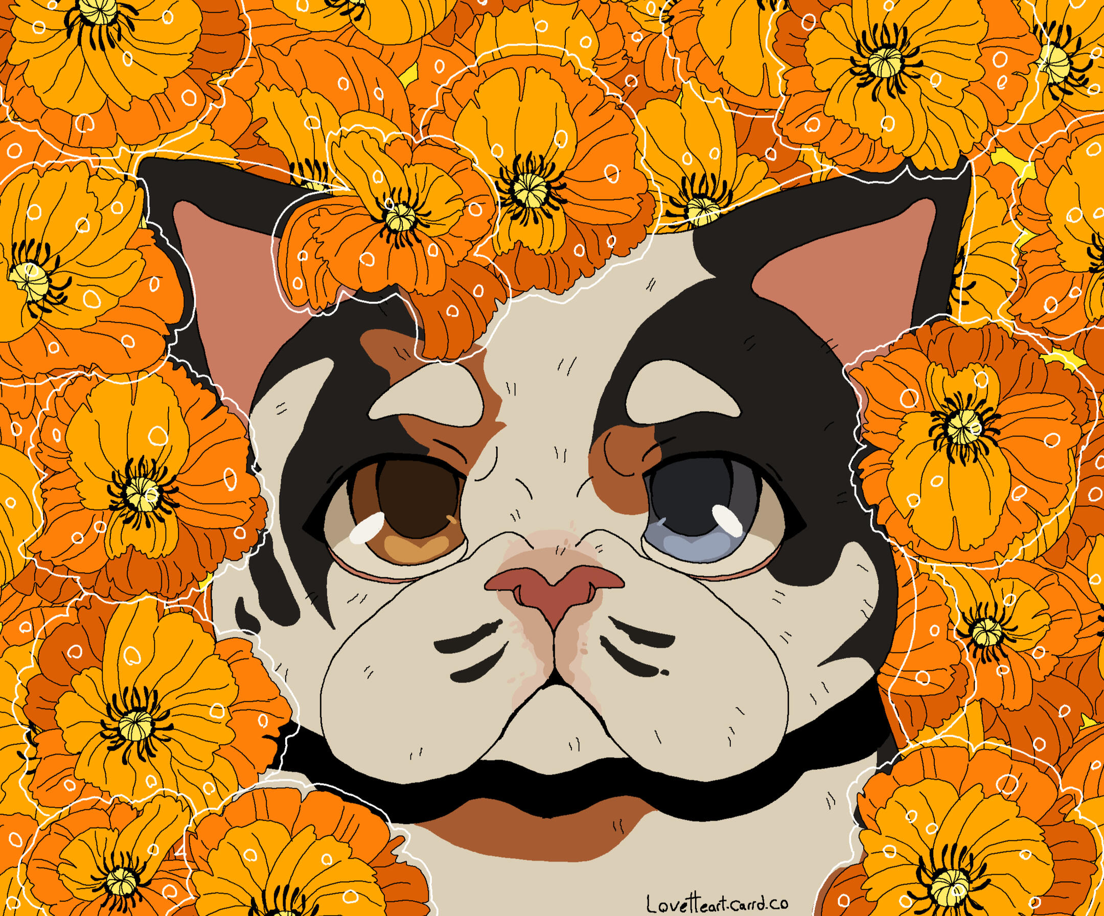 Description: A symmetrical headshot with a floral background. Backgrounds currently available: Shojo Roses, Shamrock Bed , Daisies (may or may not have the white outline depending on how light the daisies are), Leaves (Maple, Oak, Generic or Fall mix) , Poppies, Green Ivy, Violets ( tricoloured or solid), Yellow Buttercups25.00 USD Red Spider lilies (spider lilies will come with a black background and no white outline/ droplets), Blue Forget-me-nots (no white outline/ droplets and your choice of bg colour between pale neutral, green, black or yellow pop), White lilies (no white outline or droplets, set background colour of green)PSA: Lilies are extremely deadly to cats, ingesting them or even inhaling their pollen can cause kidney failure and death within as little as 3 days, please bring your cat to the vet immediately if you suspect any kind of consumption