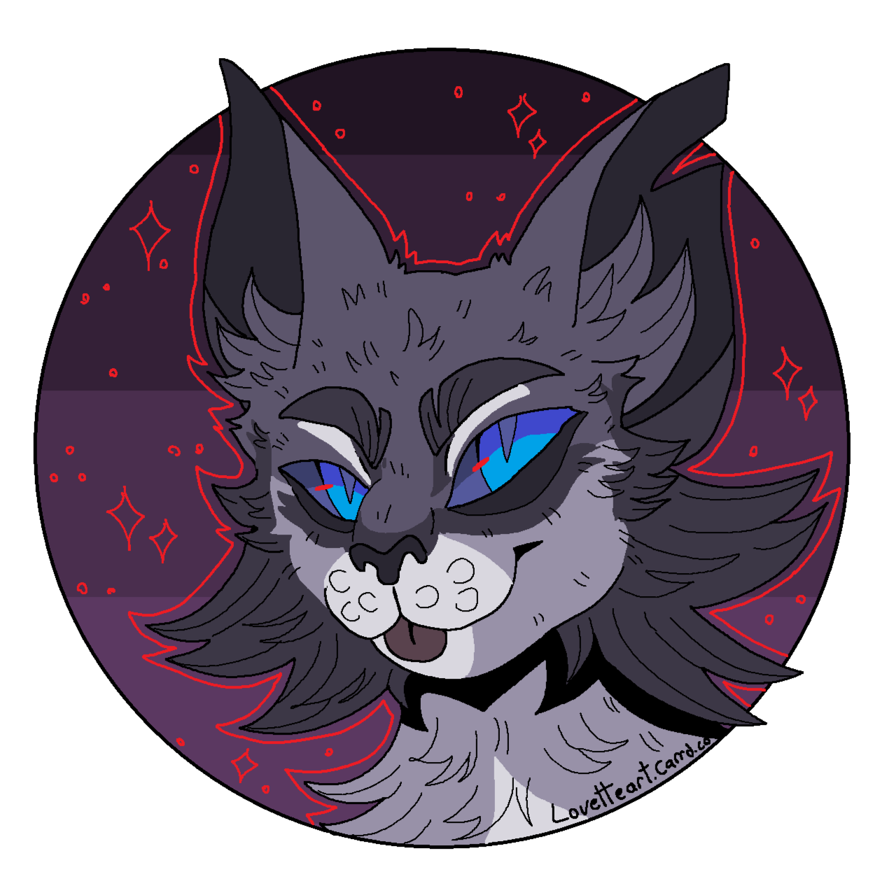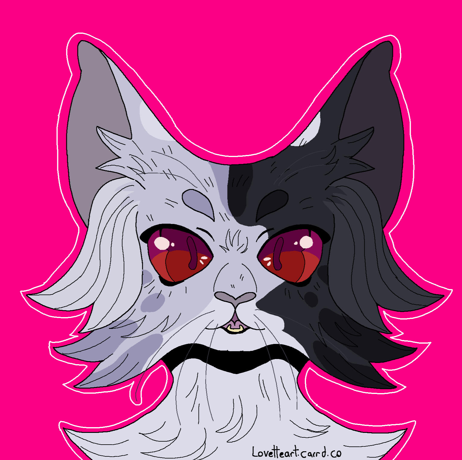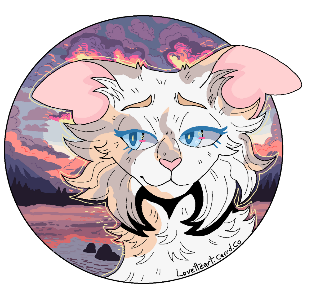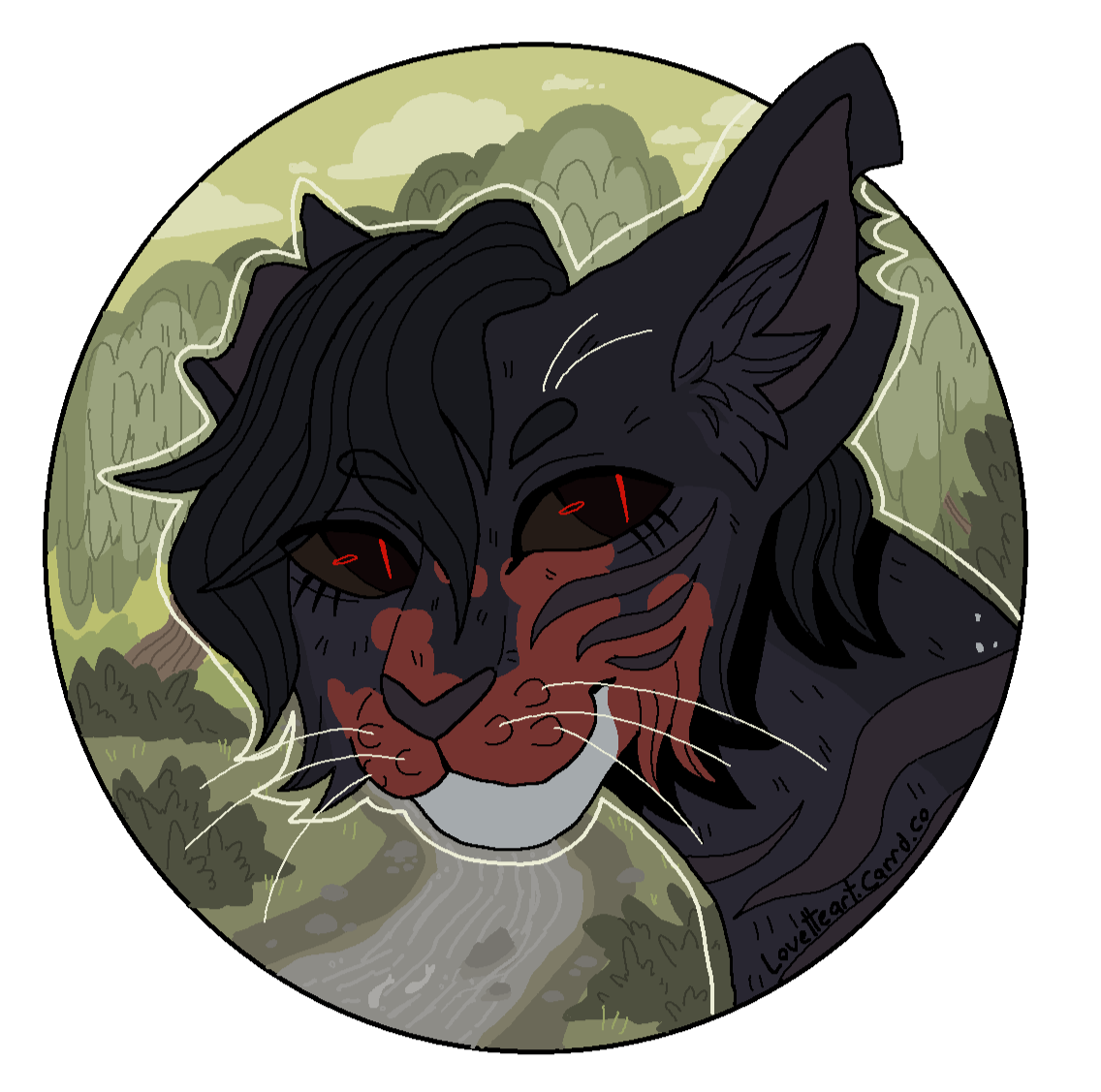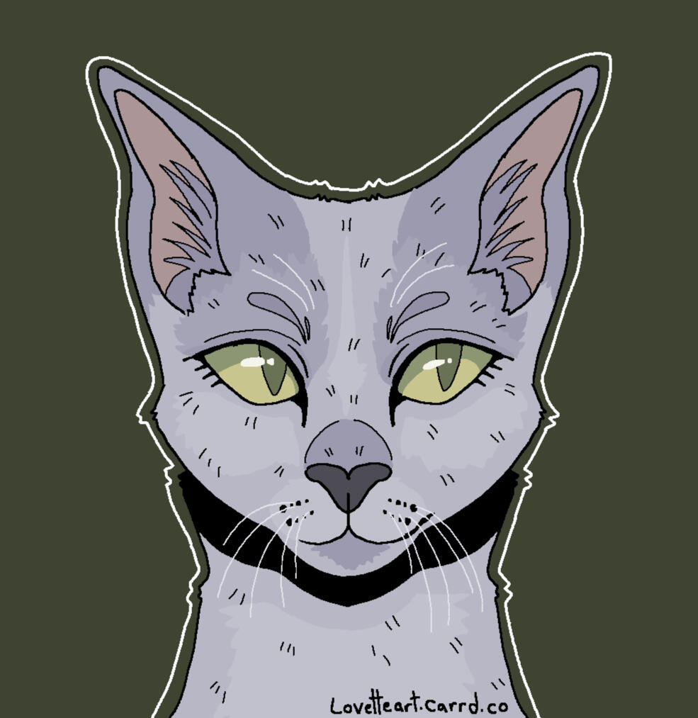 Description: Feline or feral characters. This type of commission is typically a symmetrical headshot of a feline character on a solid background with white outline. other creatures may be requested but prices may vary based on the character such as design/marking complexity, accessories, hair/bangs etc. For anthro/humanoid characters with clothes please see Badge and Button commissions.For designs based on a description or off a real photo, see Custom Headshot Commissions below