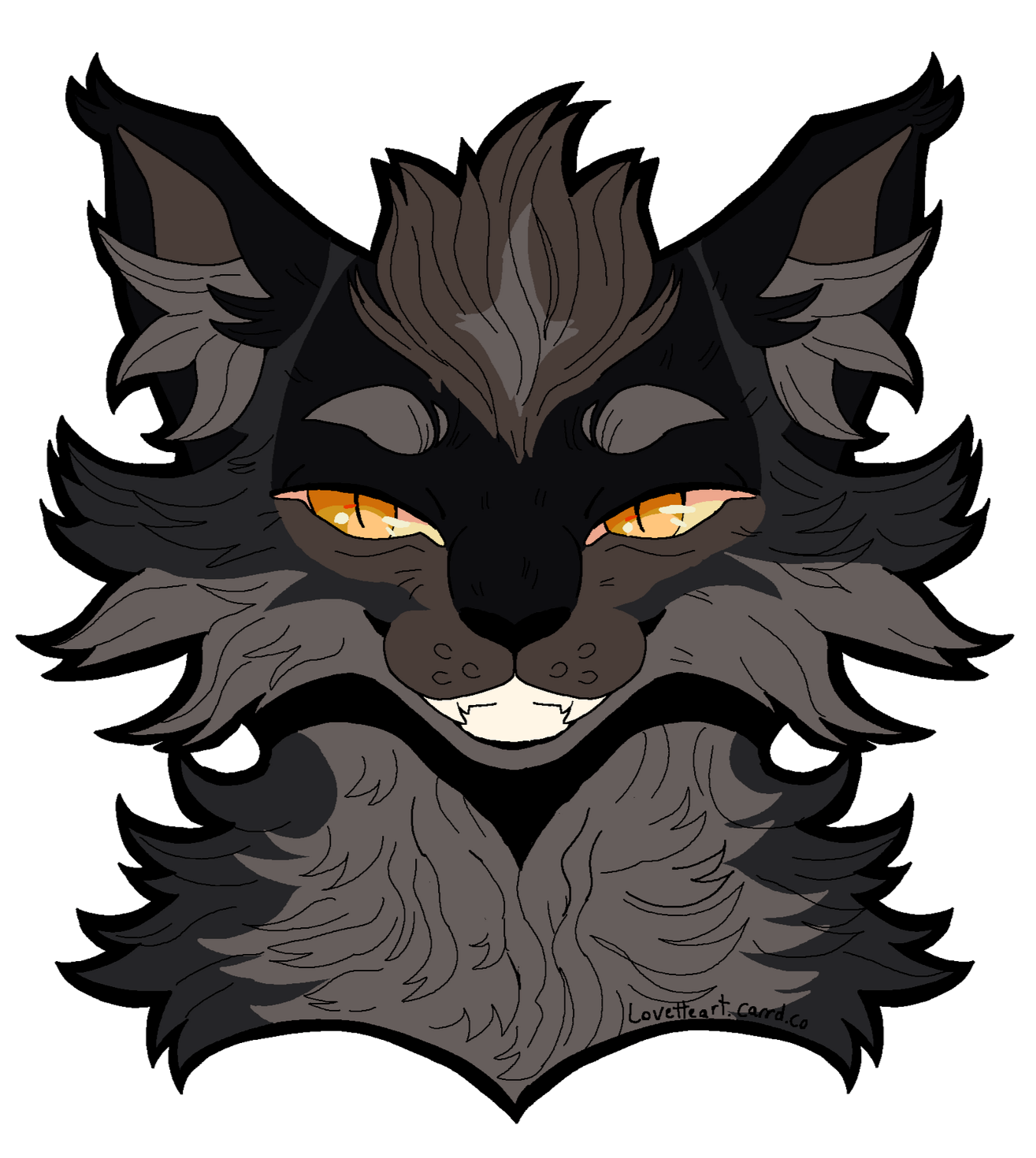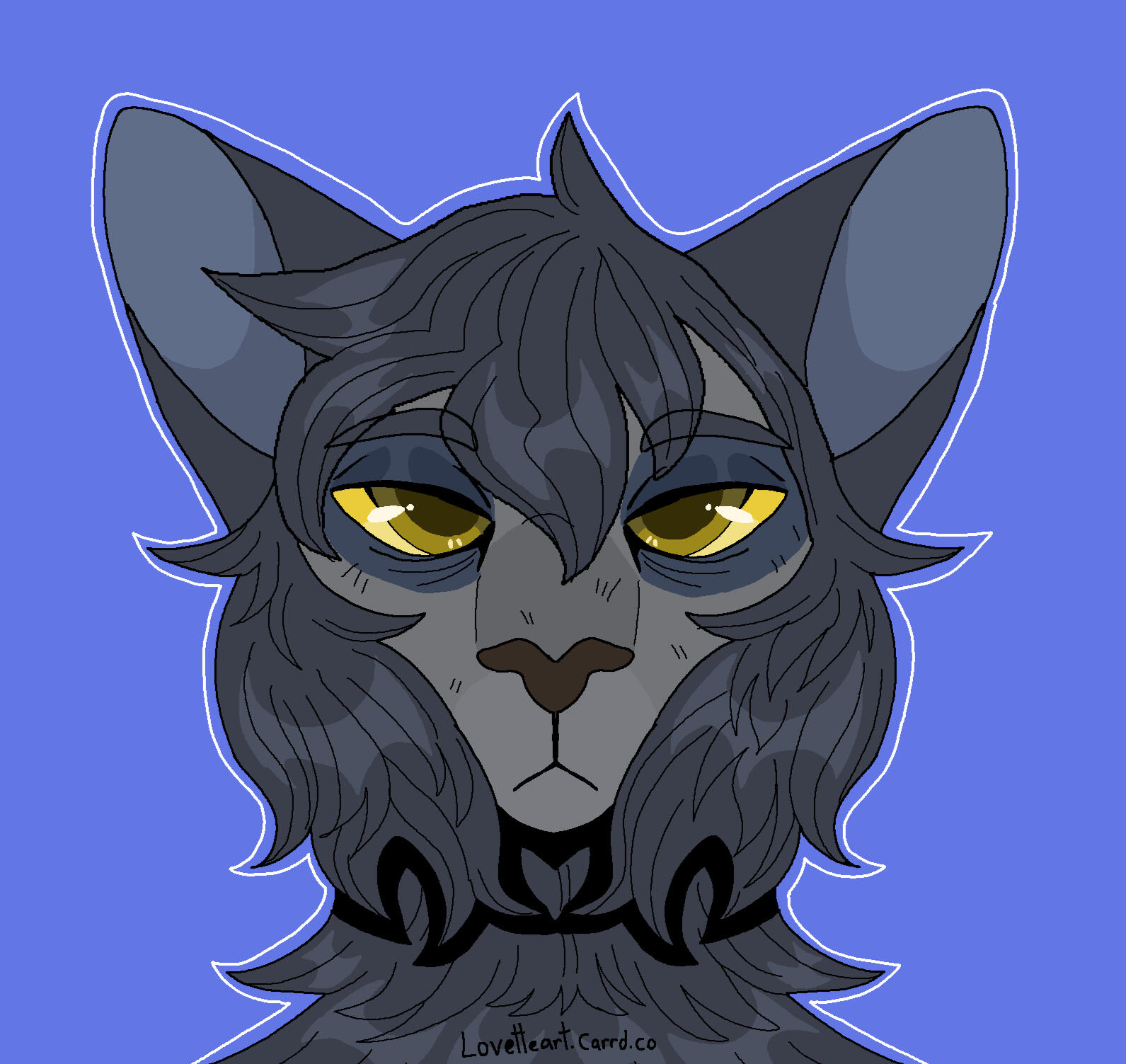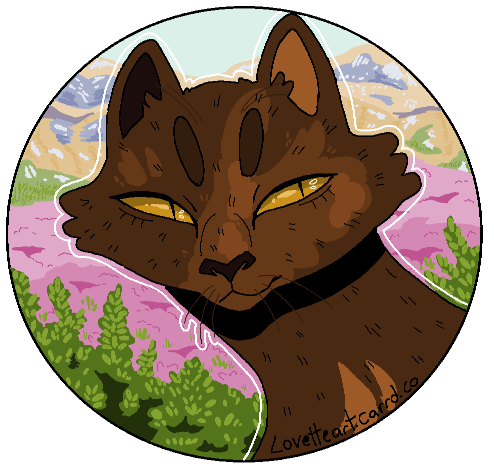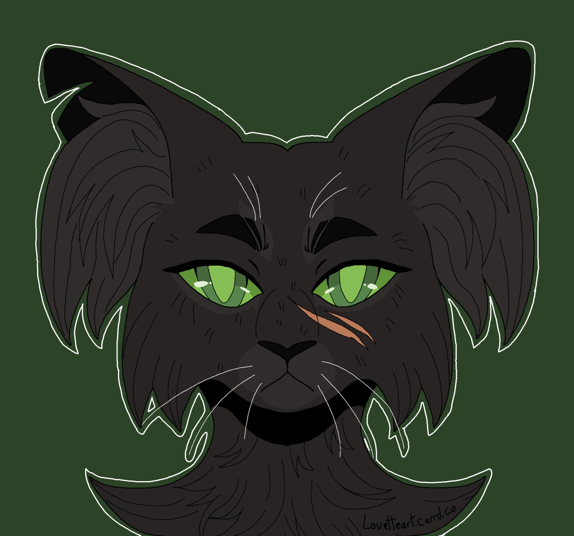 Description: Feline or feral characters. This type of commission is typically a symmetrical headshot of a feline character on a solid background with white outline. other creatures may be requested but prices may vary based on the character such as design/marking complexity, accessories, hair/bangs etc. For anthro/humanoid characters with clothes please see Badge and Button commissions.For designs based on a description or off a real photo, see Custom Headshot Commissions below