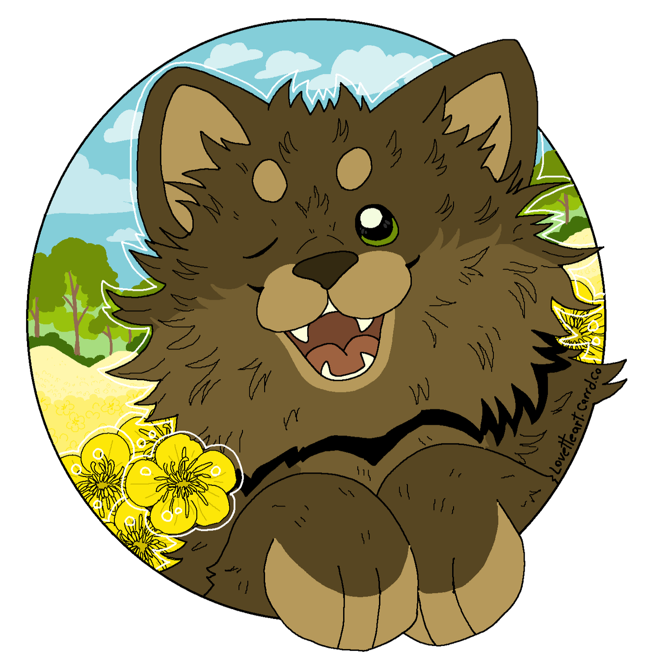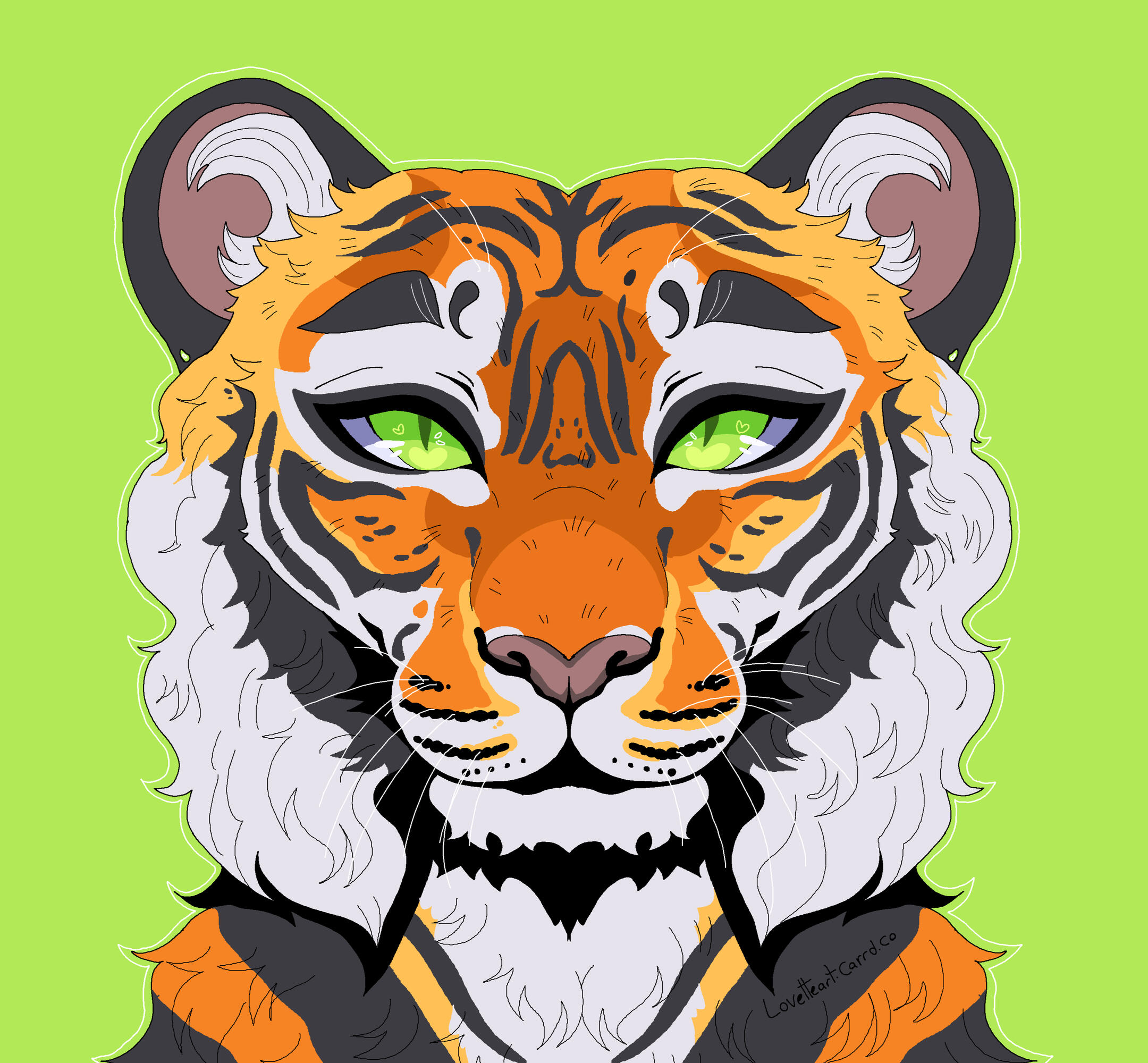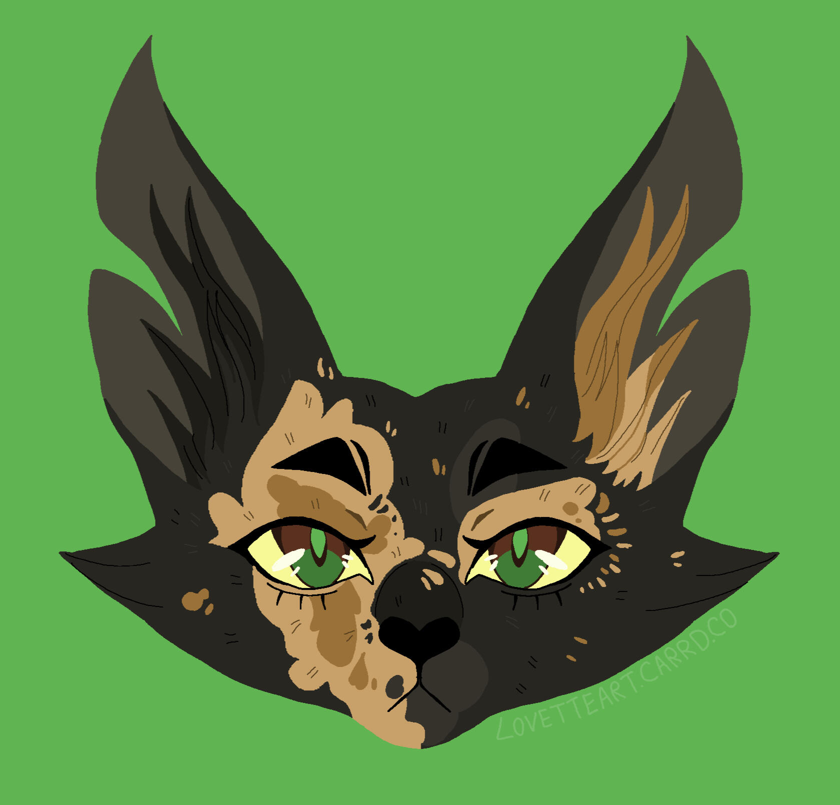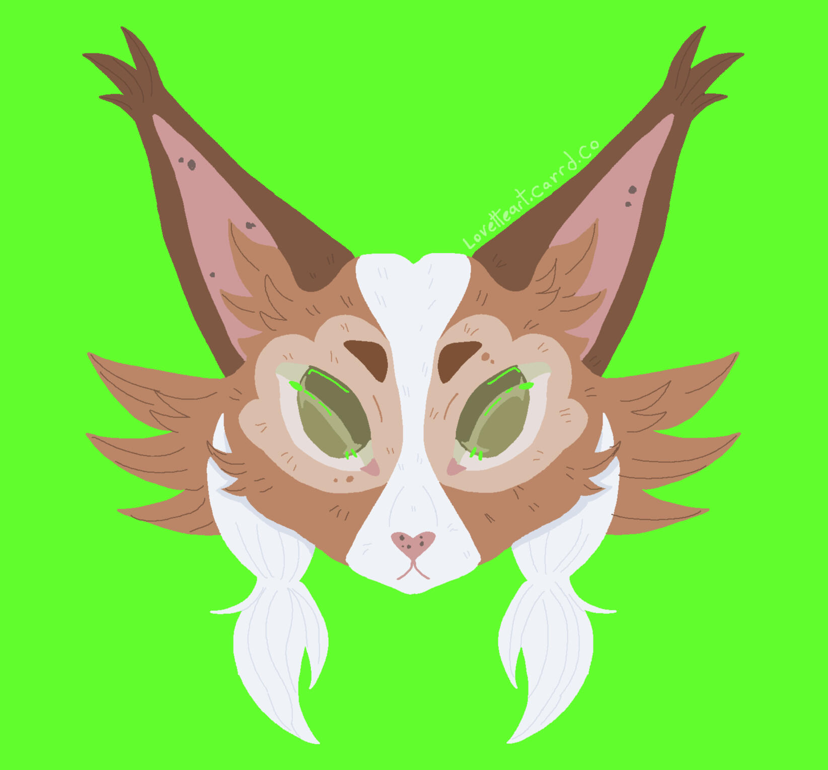 Description: Feline or feral characters. This type of commission is typically a symmetrical headshot of a feline character on a solid background with white outline. other creatures may be requested but prices may vary based on the character such as design/marking complexity, accessories, hair/bangs etc. For anthro/humanoid characters with clothes please see Badge and Button commissions.For designs based on a description or off a real photo, see Custom Headshot Commissions below